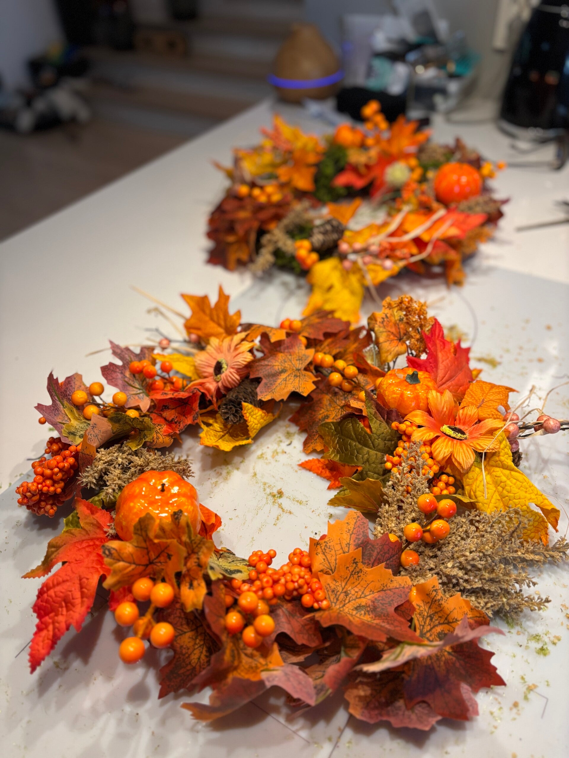 Materiały na dekoracje kupuję zazwyczaj na giełdzie florystycznej (te sztuczne również), można je też zamówić w Internecie.